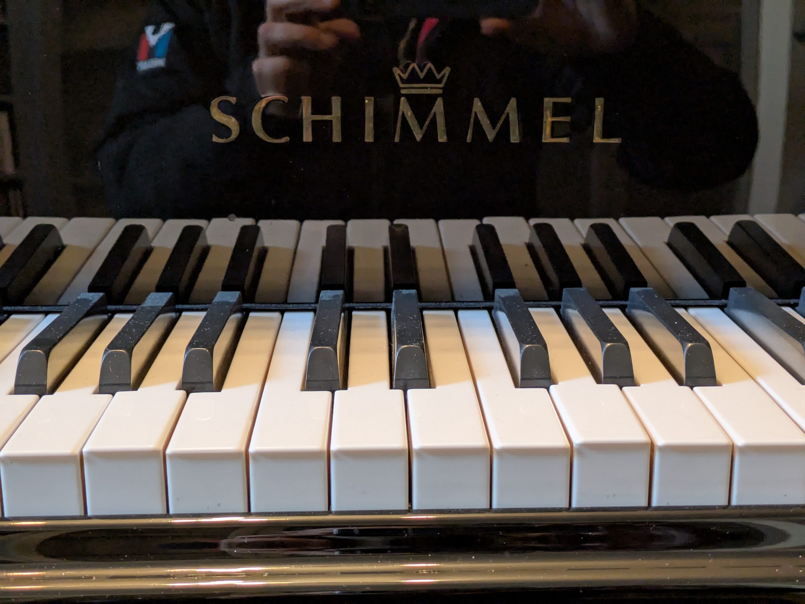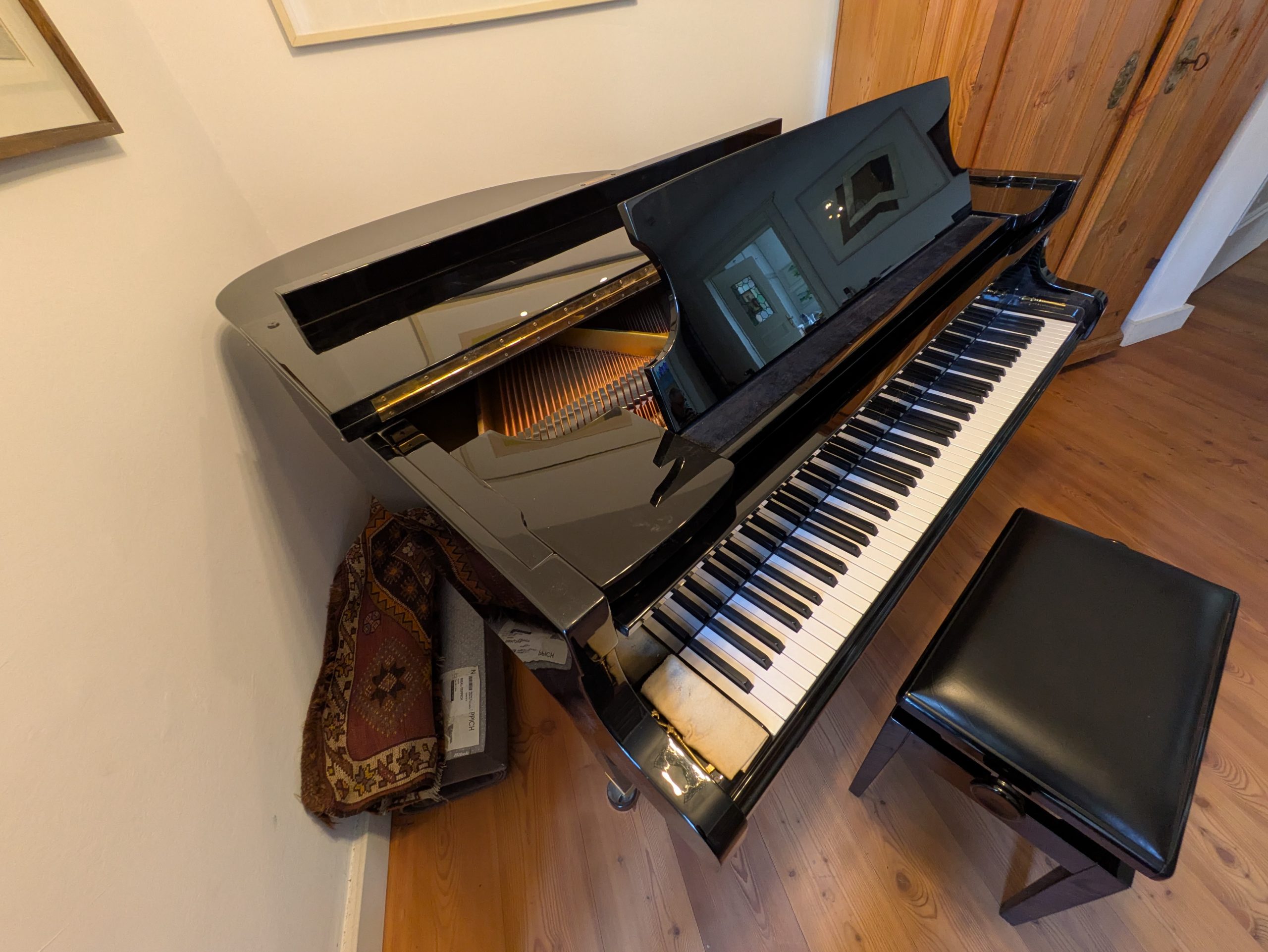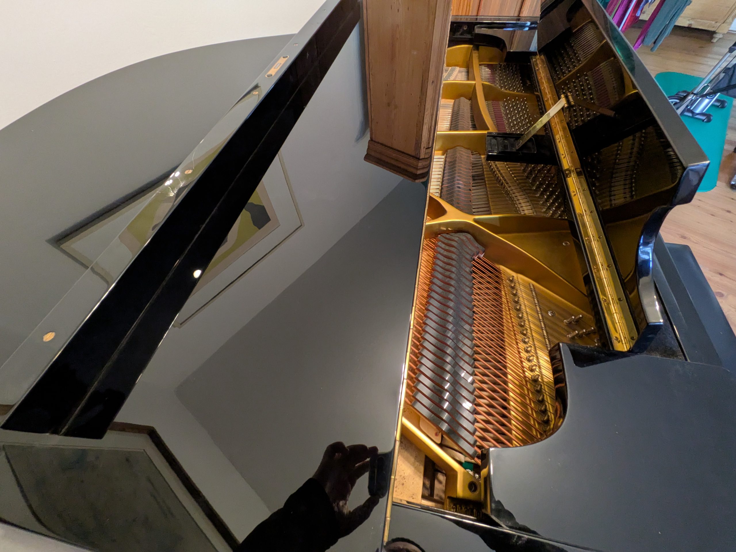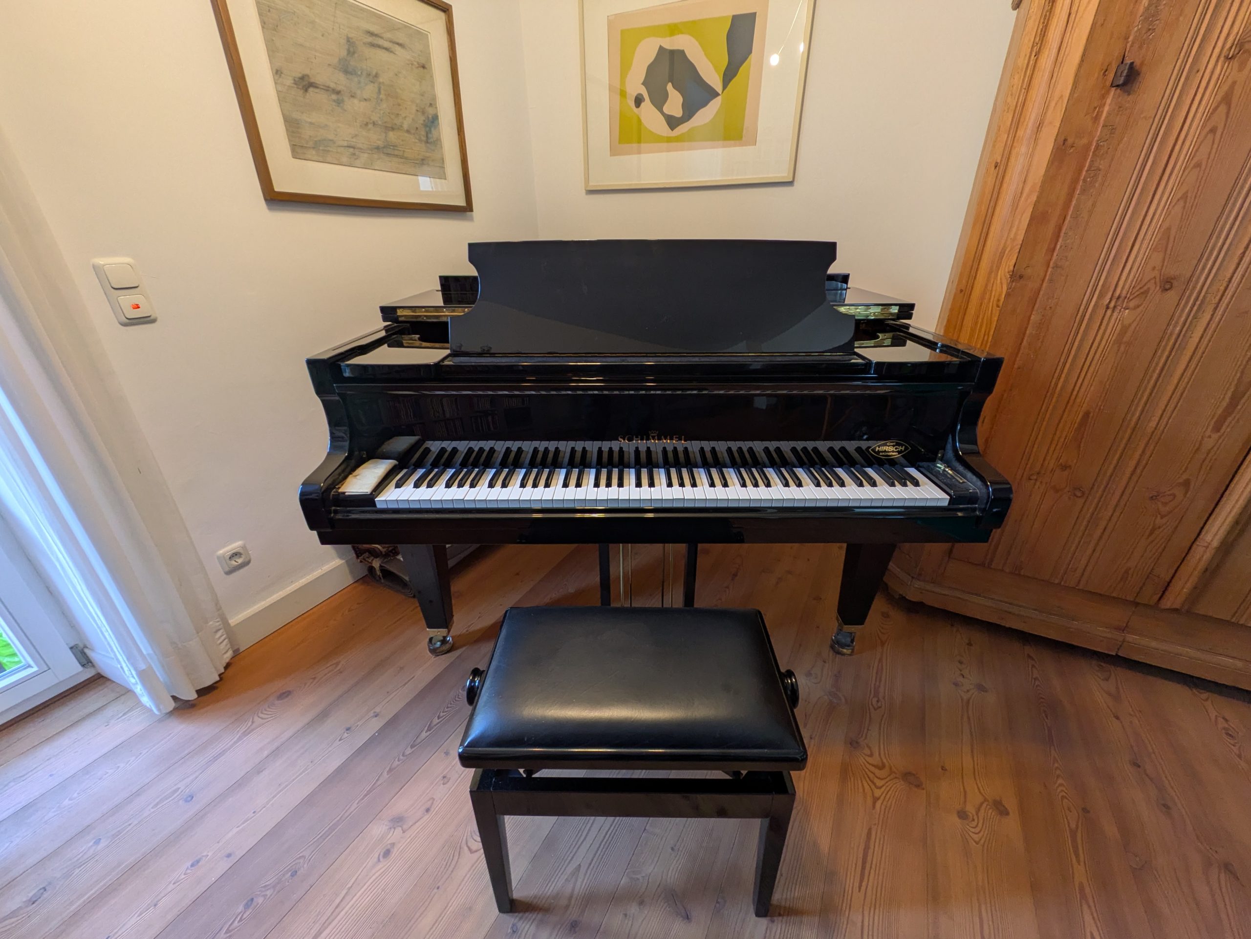 Sehr schöner, schwarz lackierter Schimmel (Stutz-)Flügel 150 (Bj. 1987) mit Klavierbank altersbedingt zu verkaufen. Das Instrument wurde insgesamt wenig gespielt und ist aktuell gestimmt. Es ist in tadellosem Zustand bis auf einen kleinen (Umzugs-)Lackschaden (s. Foto) auf der linken Seite der Abdeckung.