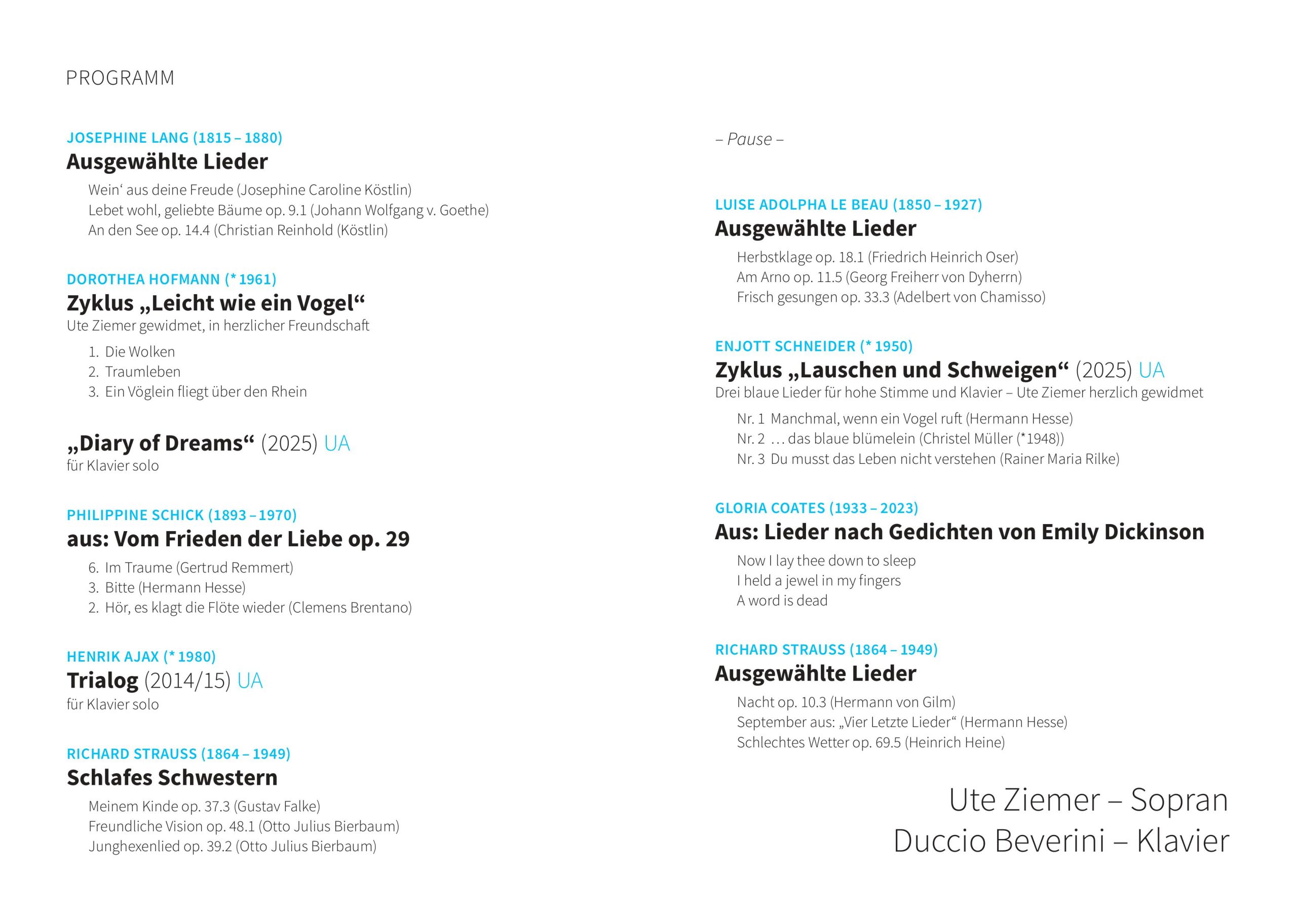 Werke von Josephine Lang, Luise Adolpha Le Beau, Philippine Schick, Richard Strauss, Gloria Coates, Dorothea Hofmann, Enjott Schneider, Henrik Ajax